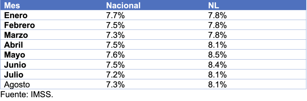 En agosto, el empleo formal en Nuevo León registró de nuevo una desaceleración al solo crearse 351 nuevos puestos de trabajo. El Estado concluyó el 8vo mes del año con 1,946,686 trabajadores inscritos en el IMSS, un 1.2% más de los que había en el mismo mes de 2024. A nivel nacional, la cifra de trabajadores fue de 22,454,917, 0.3% más en términos anuales.