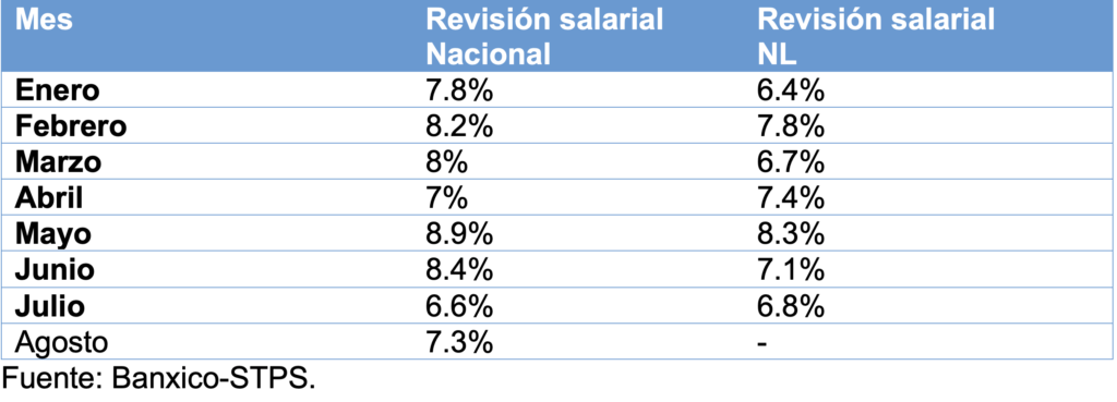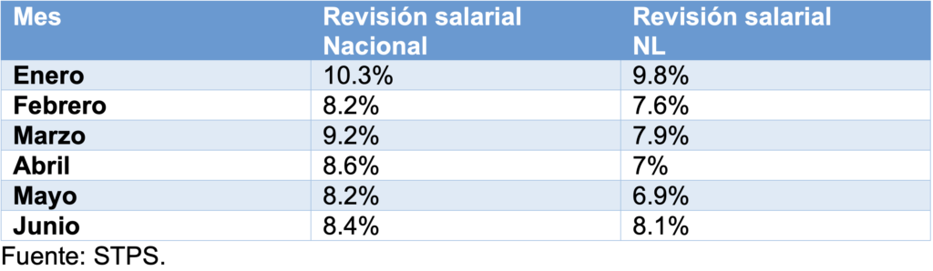 En Nuevo León, por su parte, en el séptimo mes del año hubo 4 revisiones y hace un año fueron 5. Y el alza salarial promedio negociado en ese mes fue de 6.8%.
