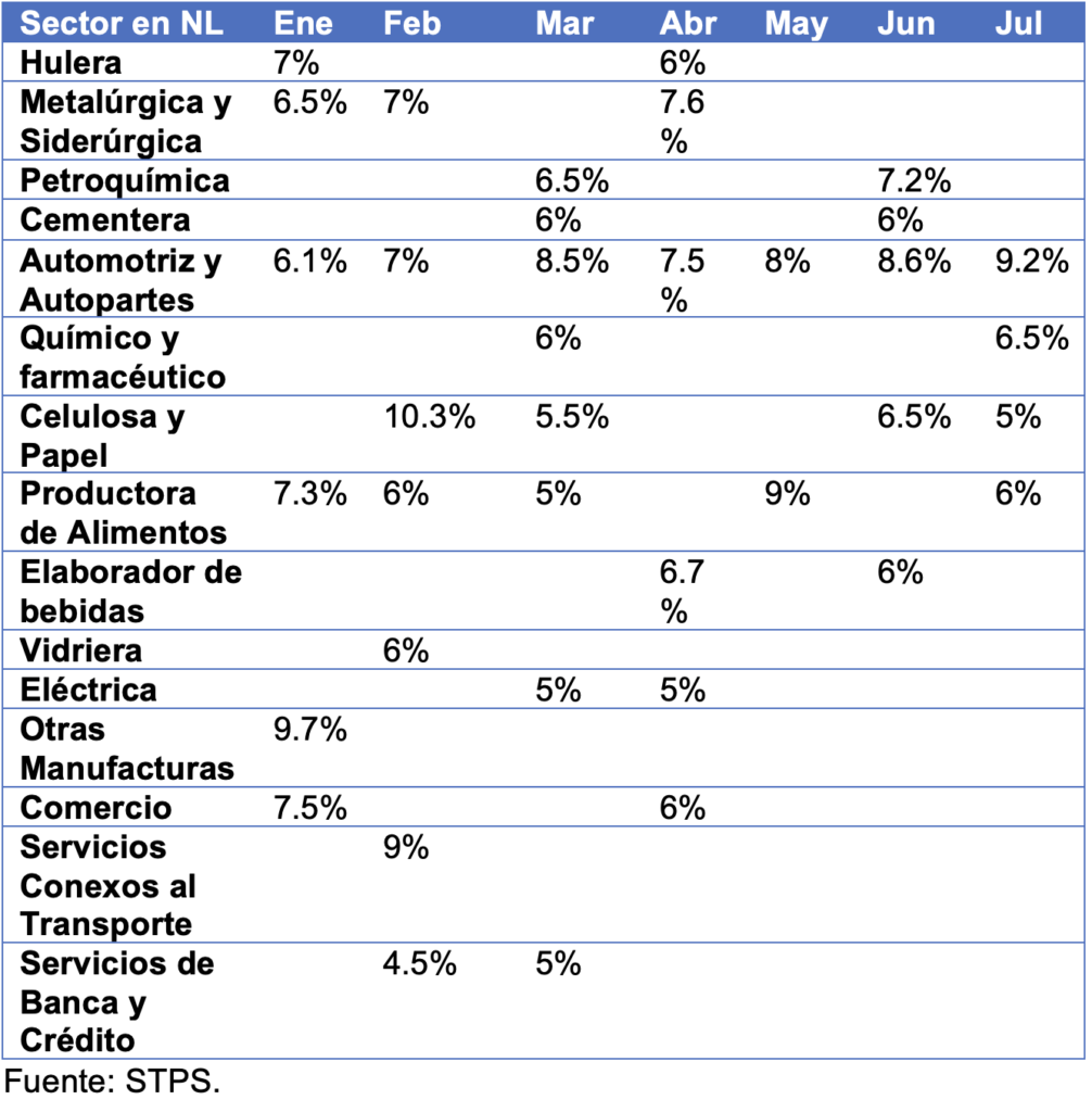 A continuación las revisiones salariales, de jurisdicción federal, de Nuevo León por sector productivo registrado en julio.
