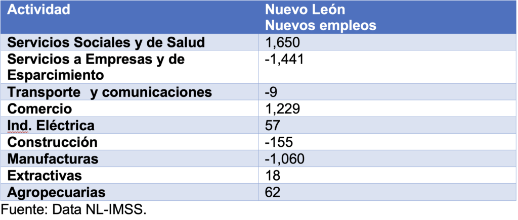 Por el contrario, las actividades que padecieron las peores bajas netas de trabajadores fueron los servicios a empresas y esparcimiento y el de la manufactura en el estado. En esta última, vuelve a caer el empleo luego del repunte del mes anterior. Por Municipio, en Nuevo León los que sí consiguieron un saldo neto positivo en empleo formal durante el 8vo mes del año fueron Monterrey, San Pedro Garza García y Pesquería, principalmente.