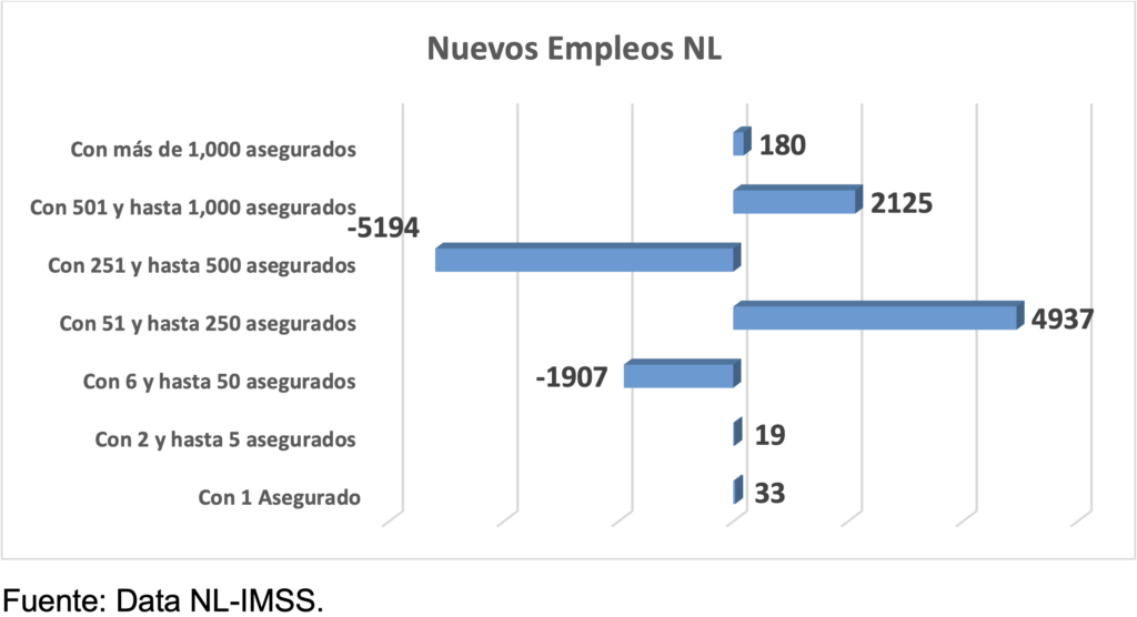 Por tamaño de empresa en Nuevo León, las medianas que emplean a más de 50 y hasta 250 trabajadores, fueron las que registraron el mayor número de nuevos empleos formales.