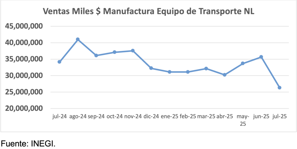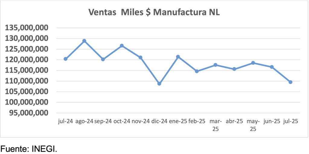 La industria manufacturera de Nuevo León en julio padeció por 1ra vez en lo que va del año, en el valor de las ventas de sus productos elaborados una caída de -9.1% anual, y por 2do mes consecutivo una baja de -6.1% mensual.