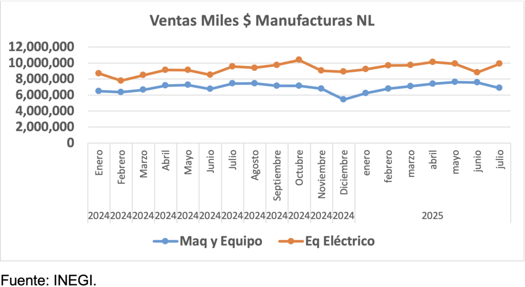 A nivel nacional, uno de los sectores más dinámicos este año ha sido el de fabricación de equipo de computación, comunicación, medición y de otros equipos, componentes y accesorios electrónicos, el cual en Nuevo León consiguió en julio por 1ra vez en el año una tasa anual positiva, de 6.2%, y un aumento mensual de 15% en el valor de las ventas de sus productos elaborados.