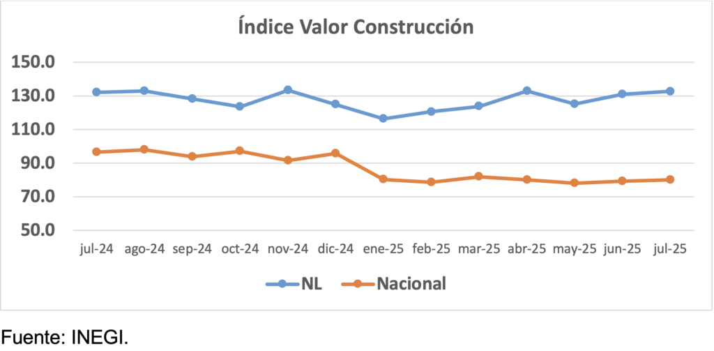 El índice del valor de la construcción en Nuevo León en julio mantuvo por 6to mes consecutivo una variación anual positiva, de 0.4%, por el contrario, el índice nacional sufrió por 7mo mes consecutivo una disminución de -17.1% anual. Respecto al mes anterior, en el Estado aumentó en 1.3%, y a nivel nacional en 0.9%.