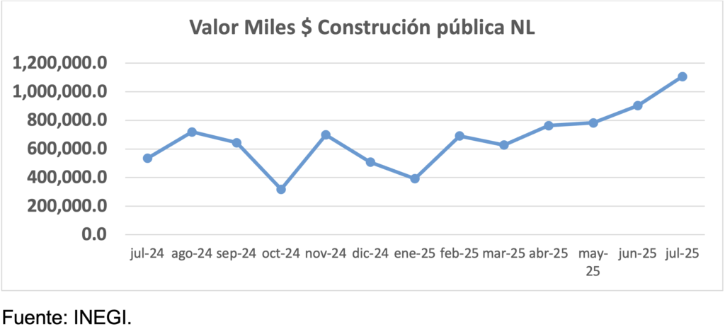 Por subsector, en Nuevo León el valor de la construcción pública por 7mo mes consecutivo registro un aumento, ahora de 106.8% anual. Respecto a la privada, el valor de la construcción padeció una caída, de -5.2% anual, luego de 5 meses consecutivos de alzas.