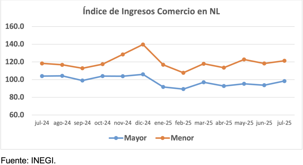En Nuevo León, los ingresos del comercio al por mayor tuvieron en julio por 7mo mes consecutivo una caída anual, ahora de -5.4%. Por el contrario, el comercio al por menor registró un aumento de 2.5% anual por 3er mes consecutivo.
