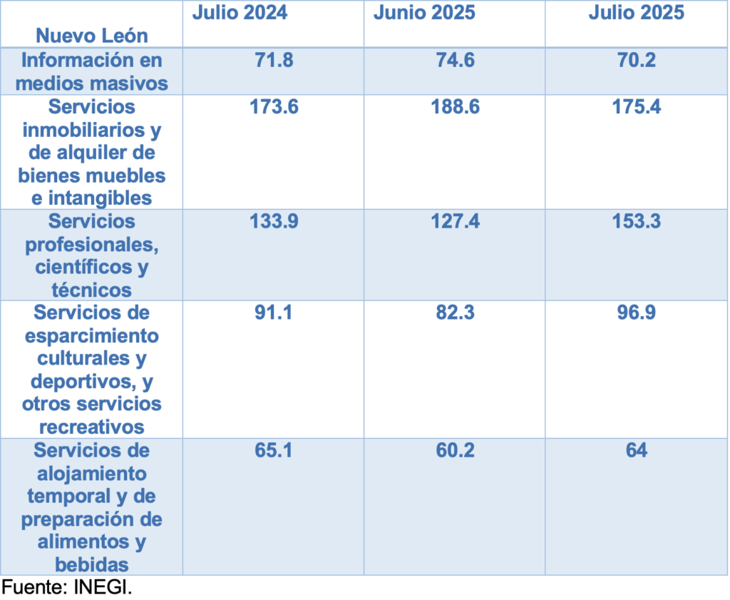 En Nuevo León, también los servicios privados no financieros mostraron en el 7mo mes del año un mejor desempeño, respecto al de hace un año. Y algunos subsectores importantes, como el de servicios profesionales, científicos y técnicos, también registraron un mayor índice de ingresos, respecto al del mes anterior.