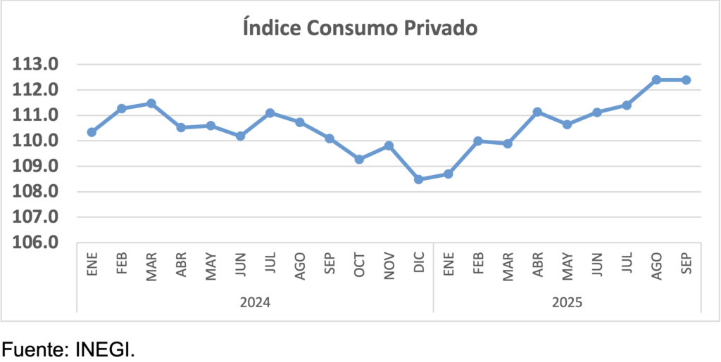 Aunque el índice de consumo privado ha mantenido una tendencia alcista, las tasas de crecimiento anual han sido menores a las registradas en el 2024.