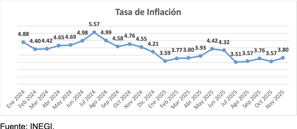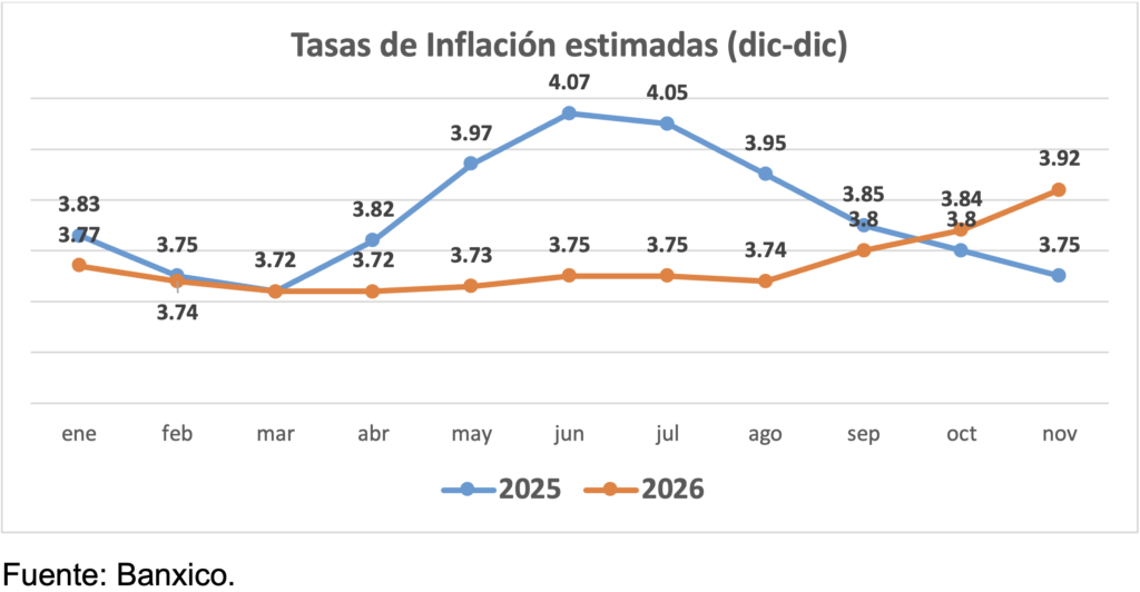 Por su parte, los analistas del sector privado consultados por Banco de México en noviembre, estiman que la tasa de inflación cierre este año en 3.75%, y para el 2026 sea de 3.92%