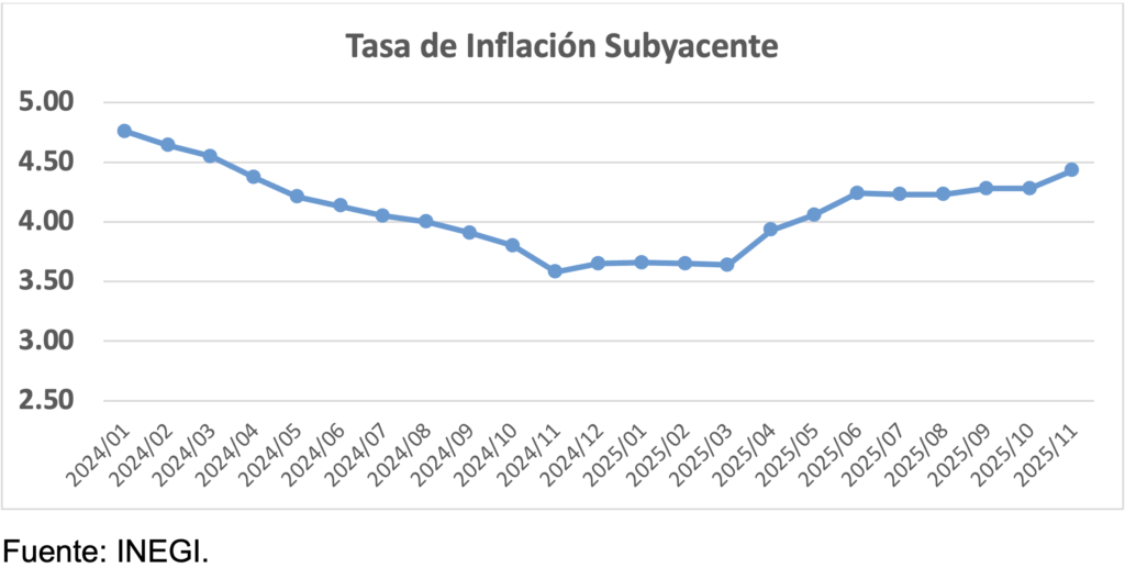 En noviembre, la tasa de inflación subyacente fue de 4.43%, desde marzo de 2024 no había alcanzado un nivel tan alto.