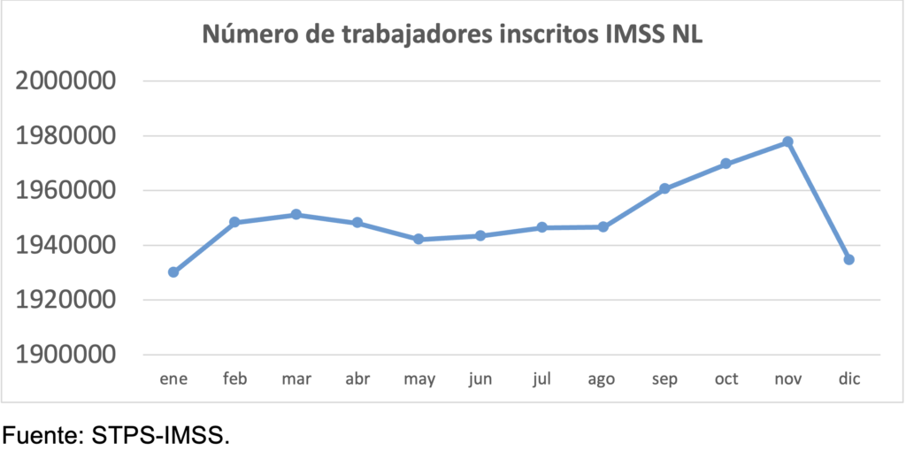 Nuevo León concluyó el 2025 con 1,934,582 de trabajadores inscritos en el IMSS, apenas 1% más de los que había en diciembre de 2024. Esto, luego de registrarse una caída de -43,043 puestos de trabajo en diciembre, respecto al mes anterior. Lo que derivó un aumento neto en el año –diciembre contra diciembre- de apenas 19,389 nuevas plazas laborales formales, la peor cifra desde el 2020 –cuando la pandemia-.