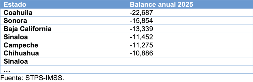 Es preocupante que 18 estados del país hayan concluido el año pasado con un balance neto negativo en materia de empleo formal, siendo las entidades federativas con peores resultados, los siguientes:
