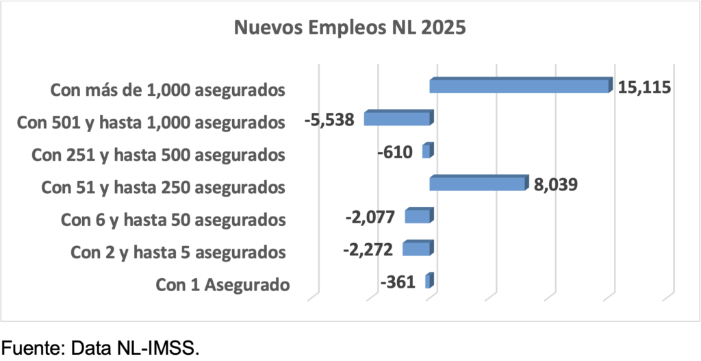 Mientras a nivel nacional las actividades terciarias –comercio y servicios- salvaron el empleo, principalmente el sector de transportes y comunicaciones –con la incorporación de choferes de plataformas digitales-, en Nuevo León fue el comercio y la industria de la construcción. Por tamaño de empresa en Nuevo León, las medianas y las grandes son las que consiguieron al cierre del 2025 un aumento neto en sus plantillas laborales formales.