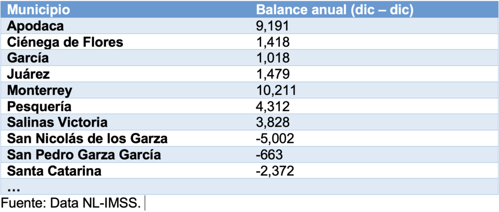 Por Municipio del Área Metropolitana de Monterrey, los Municipios que registraron trabajadores con la mayor alza anual en diciembre, fueron: Salinas Victoria 17.7%; Pesquería 12.2%; García 8.9%, Apocada 8.7%