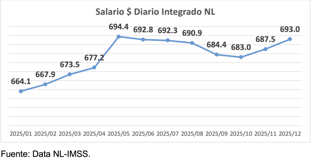 El salario diario integrado promedio de los trabajadores asegurados en el IMSS en Nuevo León concluyó el 2025 en $693, un 7.3% superior al del mismo mes del año anterior. La inercia provocada por el aumento en el salario mínimo se mantuvo.