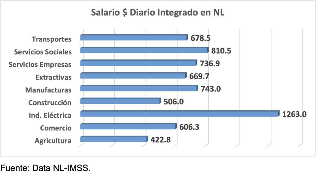 Por actividad productiva en Nuevo León, los salarios diarios integrados de los trabajadores asegurados en el IMSS, fueron: