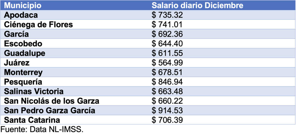 Cabe destacar, que los salarios diarios más altos entre los Municipios del Área Metropolitana de Monterrey y zona conurbada son los de San Pedro Garza García, el de Pesquería y el de Ciénega de Flores.