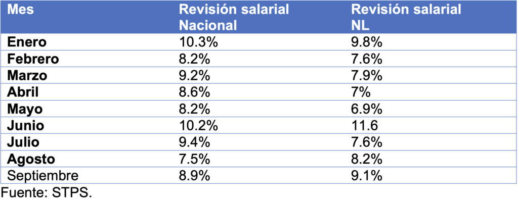 A nivel nacional, el promedio de revisión salariales de las negociaciones colectivas de jurisdicción federal de enero a noviembre, fue de 6.5%. Por su parte, las revisiones salariales de jurisdicción local en Nuevo León de enero a septiembre promediaron un alza de 8.3%, para 201,613 trabajadores.