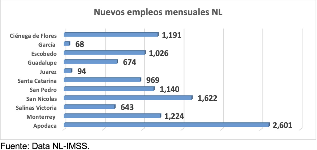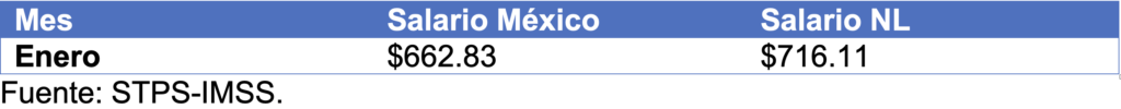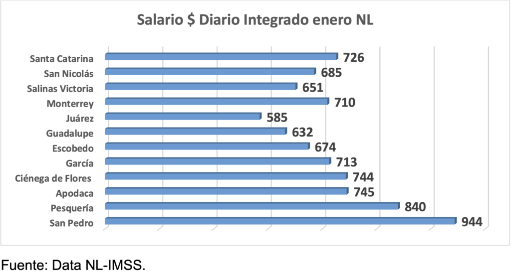 A nivel municipal en Nuevo León, durante enero, el salario diario integrado de los trabajadores asegurados en el IMSS que mayor aumento anual tuvo fue en Salinas Victoria, 15%; Pesquería, 14.8%; García, 10.8%. En Apodaca, el salario diario tuvo un aumento de 8.1%; en Monterrey, de 6.7%.