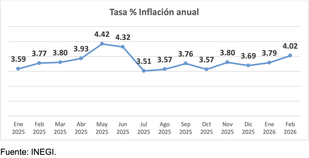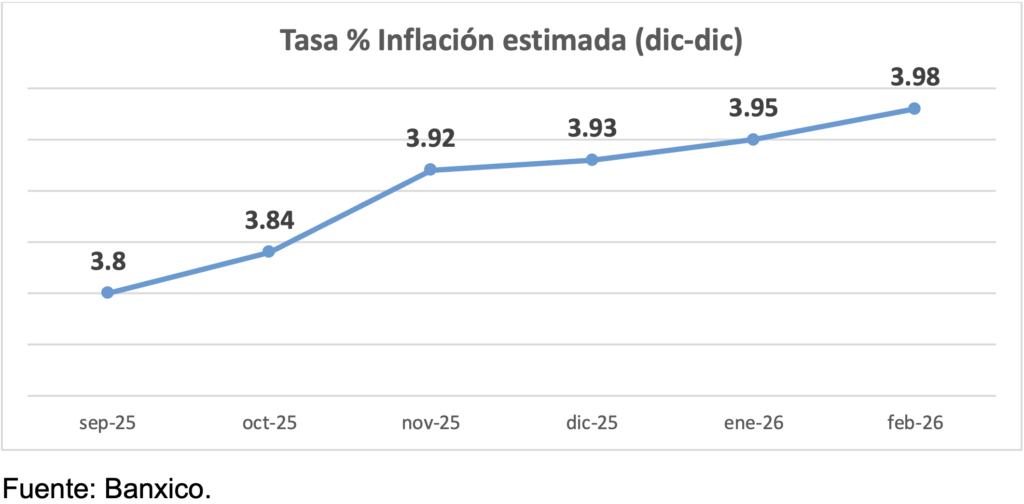En febrero, previo al conflicto de EUA-Irán, los analistas del sector privado modificaron nuevamente al alza la tasa de inflación estimada para cierre de este año, al ubicarla en 3.98%.