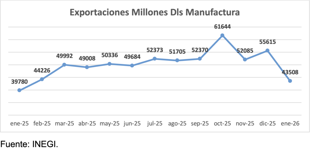 En términos mensuales, el valor de las exportaciones manufactureras del país registró en enero una caída del 21%. Sin embargo, tuvo un repunte del 9.4% en comparación con el mismo mes del año pasado.