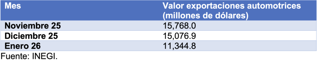Las que no lograron revertir la tendencia del mes anterior fueron las exportaciones automotrices, las cuales padecieron en el 1er mes del año una caída mensual y anual de -25 y -9%, respectivamente.