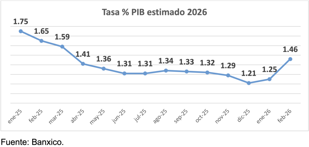 Los analistas del sector privado, consultados en febrero –previo al inicio del conflicto EUA, Israel, Irán–, también aumentaron la tasa estimada de crecimiento del PIB 2026, a 1.46%.