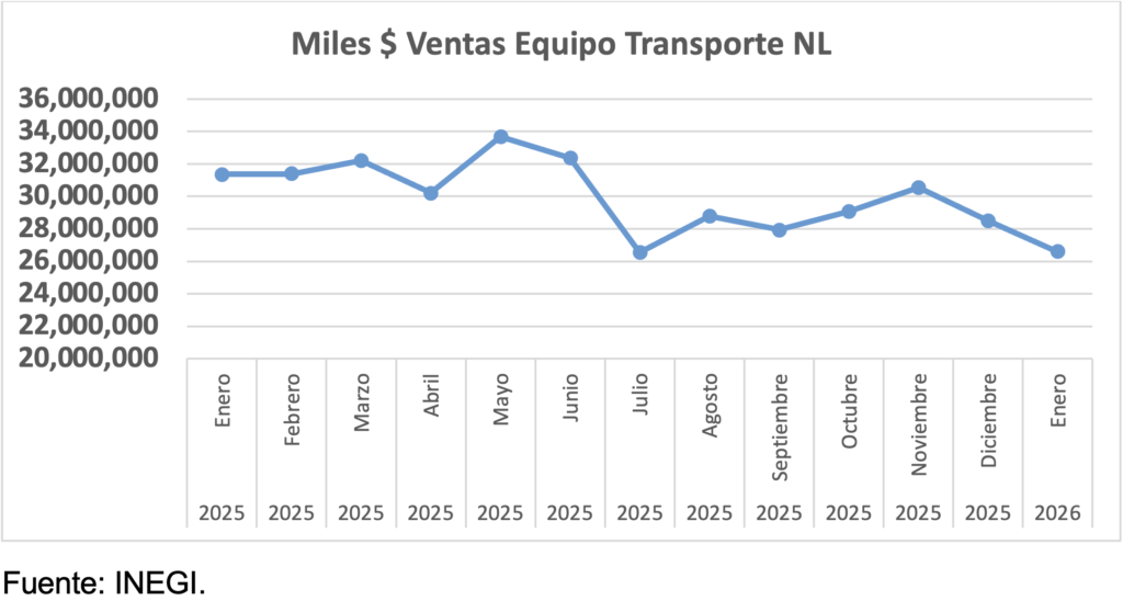 En Nuevo León, la caída manufacturera derivó de los desfavorables resultados de la industria de equipo de transporte –automotriz–, la cual en el 1er mes del año tuvo una baja de -15.2% anual y de -6.7% mensual.