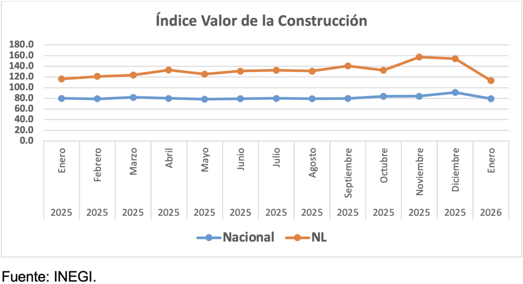 A pesar del dinamismo de la industria de la construcción pública en Nuevo León, la caída de la privada tuvo mayor peso y, en el total, el valor de la construcción en el Estado empezó el año con una baja de -3% anual y de -26.7% mensual.