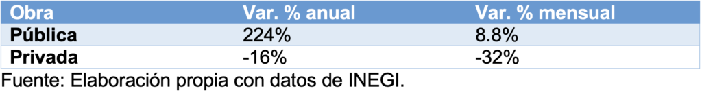 A nivel país, la construcción privada también disminuyó en enero, pero solo -5.3% anual, por su parte la pública creció también 21% anual.