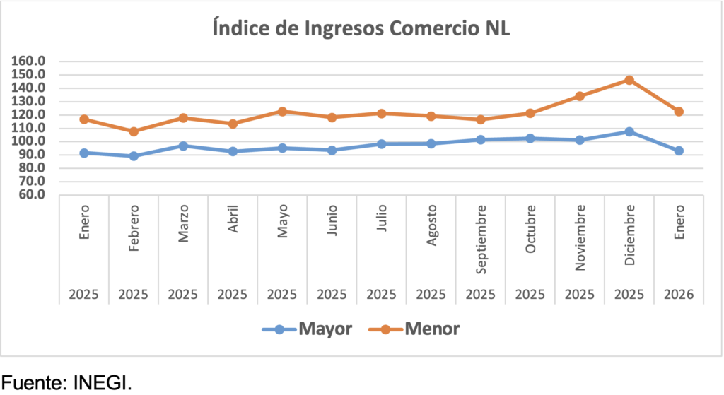 En Nuevo León, el índice de ingresos del comercio al por menor en enero alcanzó un aumento de 5.1% anual, pero una caída de -16.1% mensual. Y el comercio al por mayor registró una tasa de crecimiento de 1.7% anual y de -13.3% mensual.