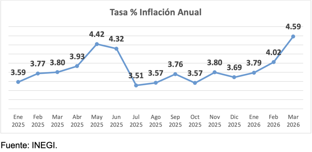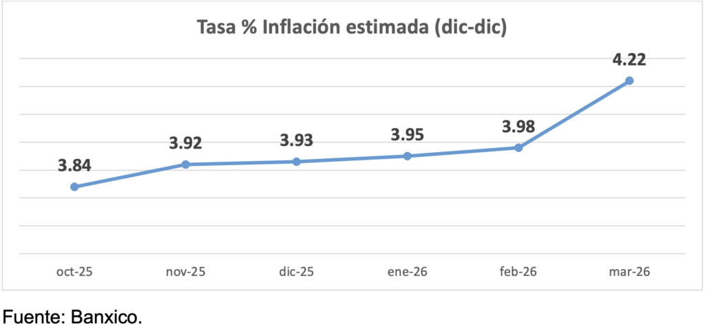 Los analistas del sector privado, consultados en marzo por el Banco de México, movieron a la alza la tasa de inflación estimada para el cierre de este 2026. Advierten que podría concluir por encima del 4%, fuera del rango de la meta del Banco de México.