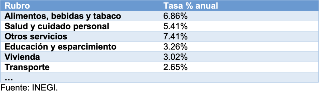 El aumento en precios fue empujado principalmente por el rubro de alimentos, bebida y tabaco, el cual alcanzó una variación de 6.86% anual. Causado por el alza en los precios de hortalizas (tomate, chile serrano…).