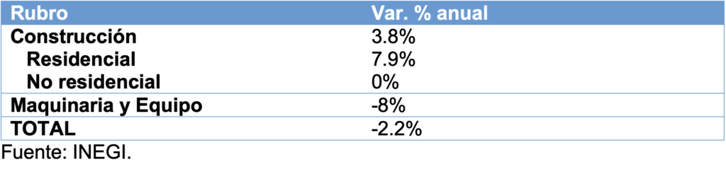 La baja en la inversión fija bruta provino de la disminución en inversión de maquinaria y equipo, que sufrió una caída de -8% anual. Por su parte, el de la construcción consiguió un alza de 3.8% anual.