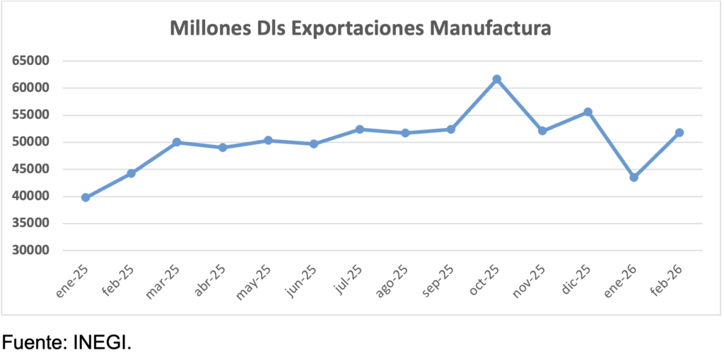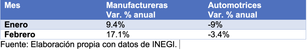 En febrero, las exportaciones manufactureras totales consiguieron un alza de 17.1% anual. Por su parte, las automotrices, que representan una 3ra parte de las totales, volvieron a caer, pero en menor grado, solo -3.4% anual.
