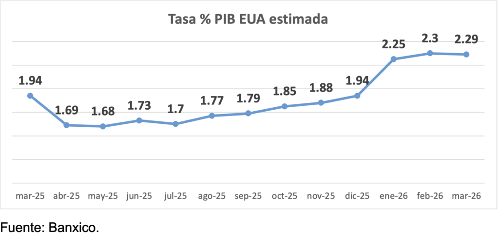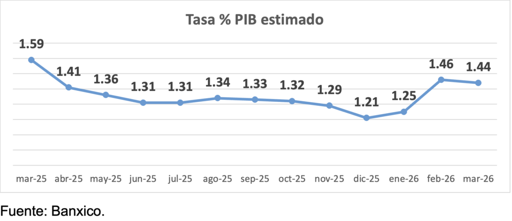 Por su parte, los analistas del sector privado consultados por Banco de México en marzo disminuyeron la tasa esperada del PIB 2026 a 1.44%.