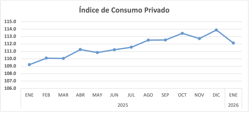 Otra variable importante en la ecuación del PIB, es el consumo. En enero, aunque tuvo una caída mensual de -1.5%, en términos anuales mantiene una tendencia de crecimiento, ahora de 2.6%.